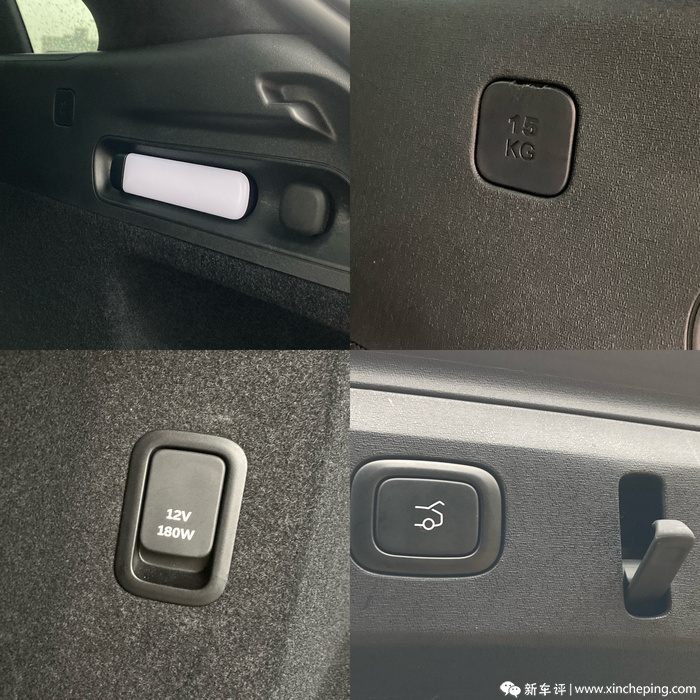 接下来,我说一下几个我认为在该车上好与不足的点。首先我们来说说好的方面,它们都集中在了尾部方面,例如在后备箱位置,新车配备了15KG挂钩、可拆卸手电筒、12V电源以及多个锚点等,同时为尾门位置也配有一个2KG挂钩,极大程度上满足了装载性和便利性。