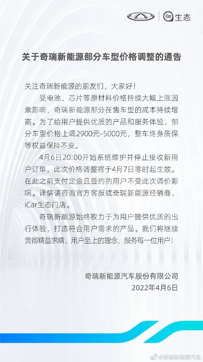 4 月 6 日,奇瑞新能源汽车表示,受电池、芯片等原材料价格持续大幅上涨因素影响,奇瑞新能源部分在售车型的成本持续增高,部分车型价格上调 2900-5000 元。4 月 6 日 20:00 开始系统维护并停止接收新用户订单,此次价格调整将于 4 月 7 日零时起生效。值得注意的是,这是奇瑞新能源 3 月 17 日宣布价格调整后的二连涨。