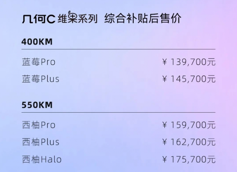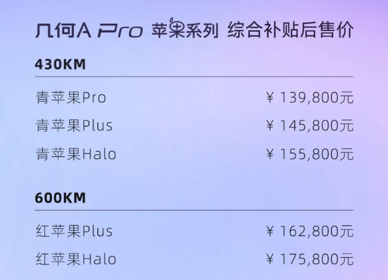 续航方面,几何 A Pro 苹果系列将有 430km 和 600km 两种可选;几何 C 维果系列有 400km 和 550km 两种可选。