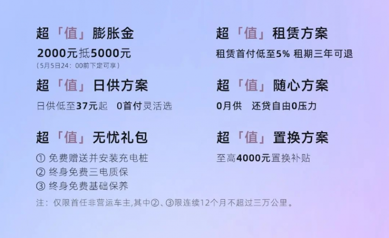 权益方面,可享 2000 元抵 5000 元膨胀金、租赁首付低至 5% 租期三年可退、日供低至 37 元、0 首付灵活选、免费赠送并安装充电桩、终身免费三电质保、终身免费基础保养、至高 4000 元置换补贴。