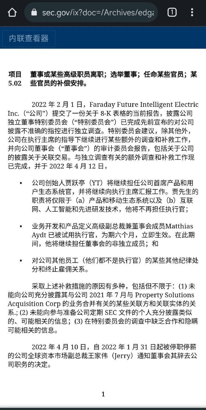 在两天前,此前被停职停薪的 FF 核心高管之一、资本部副总裁王佳伟已从 FF 离职,FF 内部的华人高管团队对其公司的影响力也正在削弱。