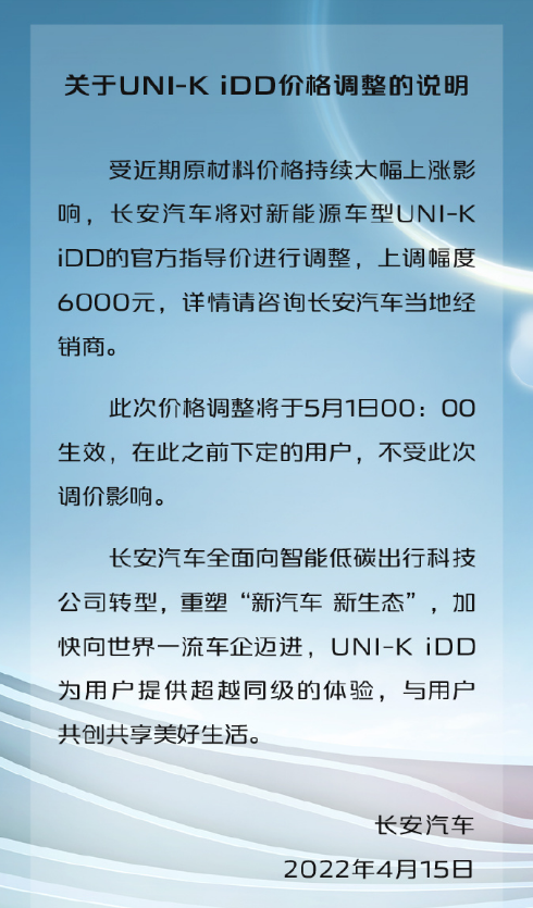 4 月 15 日,长安汽车发布官方消息。受目前原材料价格大幅上涨的影响,旗下插电混合动力 SUV 车型 UNI-K iDD 的官方指导价将进行调整,上调幅度为 6000 元。