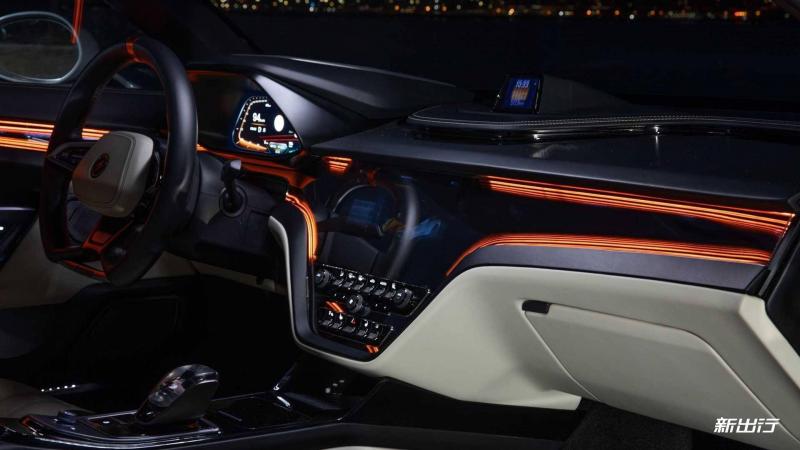 尾部造型相比车头和车侧来说就要显得有未来感不少,首先尾部没有采用一个常规的造型,而是采用了一个环绕式的灯带设计,内部的造型与车头的相同。