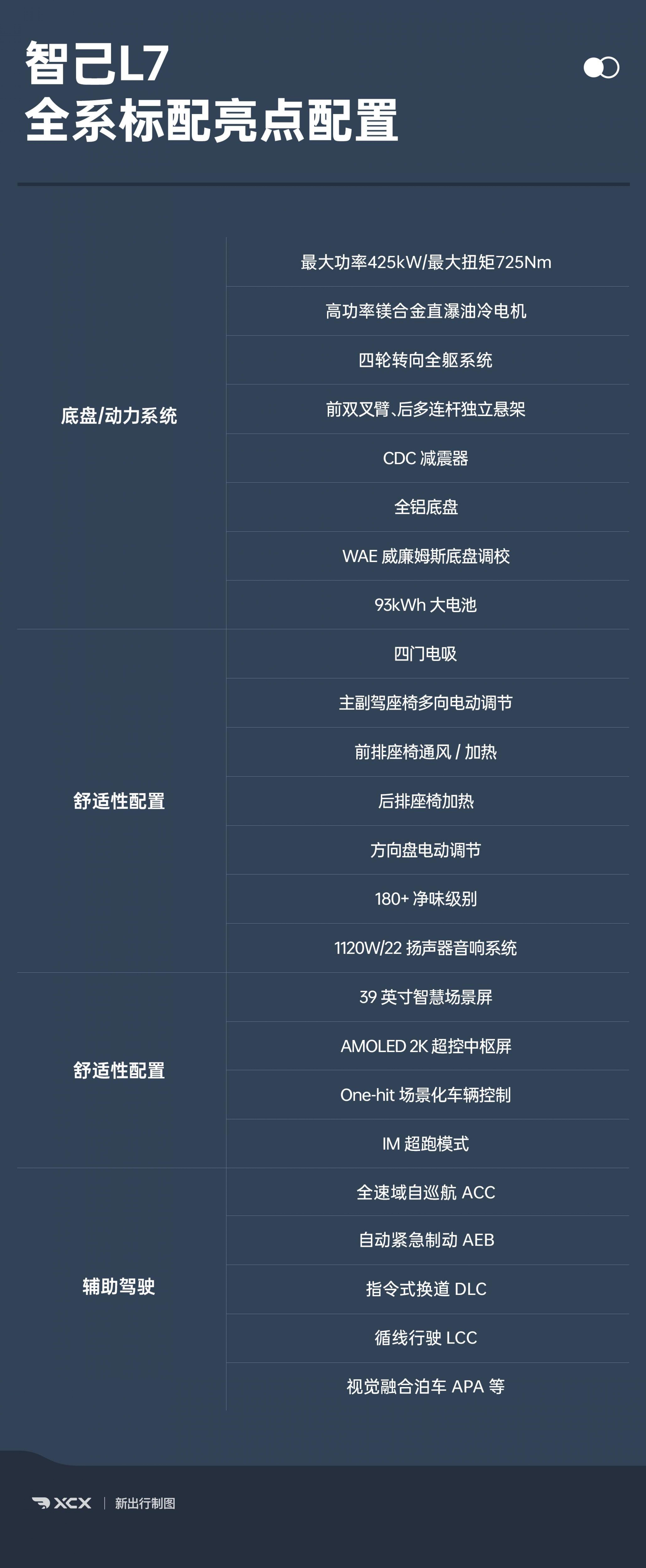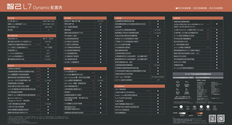 配置方面,L7 Dynamic 在标配了 19 英寸空气动力学轮毂、高功率油直瀑油冷电机、四轮转向系统、CDC 减震器、93kWh 大电池、四门电吸、主副驾座椅多向电动调节前排座椅通风/加热后排座椅加热、180+静味级别1120W/22 扬声器系统等配置,详见上面的官方配置表与亮点一览表。
