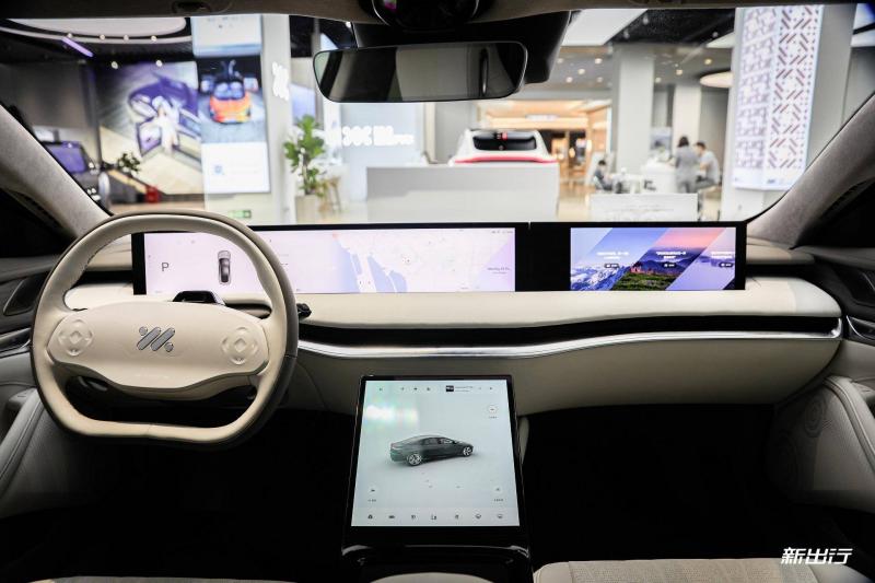 座舱方面,L7 的座舱由巨幅联屏和位于中控下方的中枢屏组成,除此之外基本没有其他的视觉元素干扰,整个中控看起来非常简洁干净,但又具有未来感。在内饰配色上,智己 L7 提供了素染追光、秘境逐黑、岩磨寻棕三个配色可选。