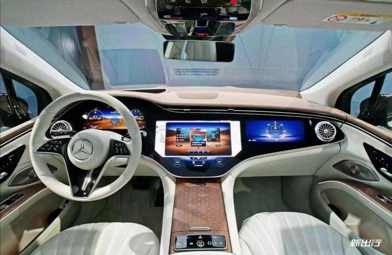 内饰方面,新车同样与 EQS 的内饰设计风格保持一致,采用了 MBUX Hyperscreen 系统的 12.3 英寸 OLED 屏,同样可选 EQS 上相同的 56 英寸曲面屏幕,内部集成了主驾驶仪表、中控大屏、副驾驶娱乐屏三块屏幕。
