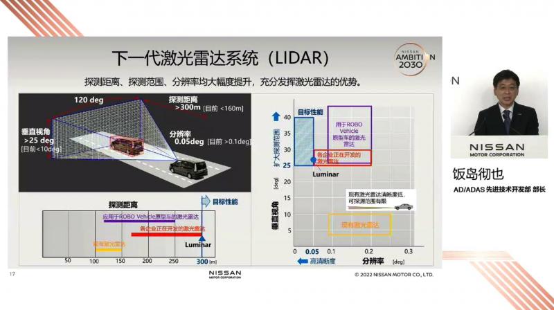 目前正在开发中的样车采用高性能传感器,可准确捕捉周围物体的位置及前方 300 米外的障碍物。今后的课题是传感器的小型化和削减成本。日产力争到 2025 年前完成开发,到 2030 年用于所有新车。