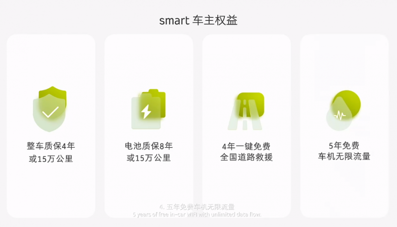车主权益方面,将提供整车质保 4 年或 15 万公里、电池质保 8 年或 15 万公里、4 年一键免费全国道路救援以及 5 年免费车机无线流量。