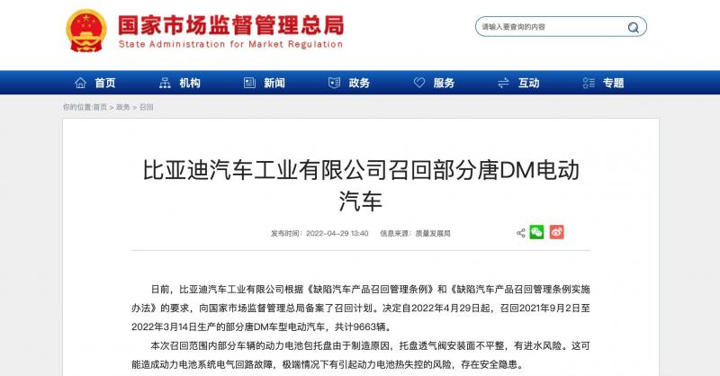 决定自 2022 年 4 月 29 日起,召回 2021 年 9 月 2 日至 2022 年 3 月 14 日生产的部分唐 DM 车型电动汽车,共计 9663 辆。
