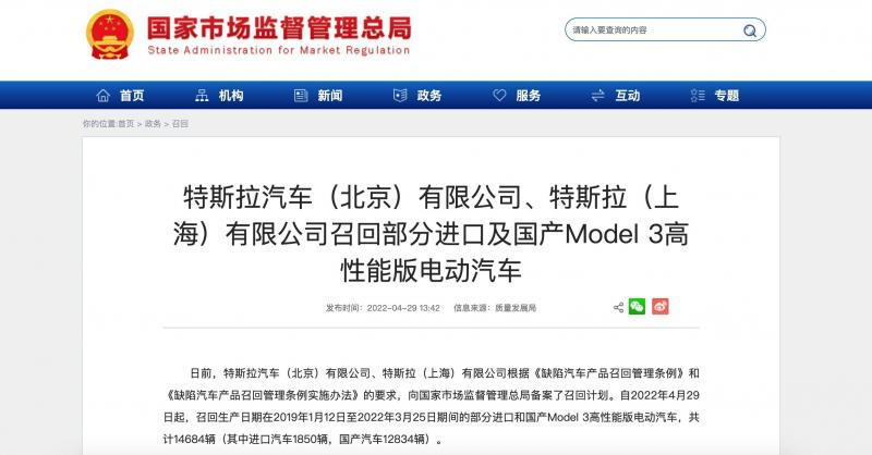 自 2022 年 4 月 29 日起,召回生产日期在 2019 年 1 月 12 日至 2022 年 3 月 25 日期间的部分进口和国产 Model 3 高性能版电动汽车,共计 14684 辆(其中进口汽车 1850 辆,国产汽车 12834 辆)。