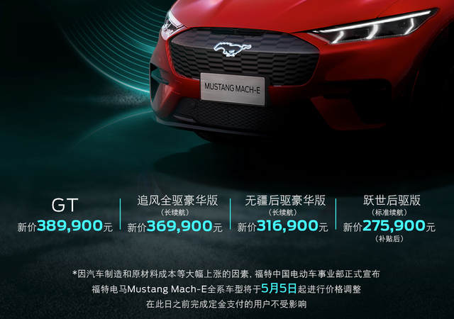 福特官方宣布,福特 Mustang Much-E 全系车型将于 5 月 5 日正式调价,涨价幅度在 7000-22500 元。