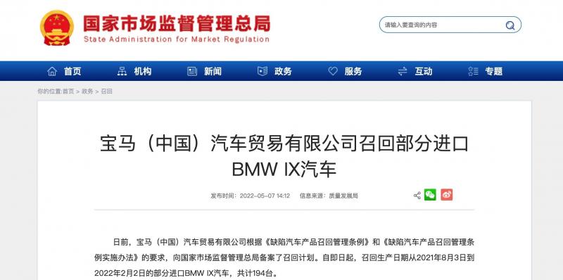 自即日起,召回生产日期从 2021 年 8 月 3 日到 2022 年 2 月 2 日的部分进口 BMW IX 汽车,共计 194 台。