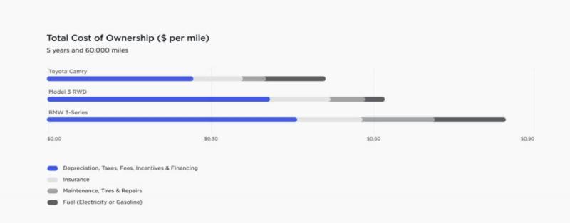 产品方面,特斯拉先前提到,四驱版本特斯拉 Model 3 在行驶 6 万英里时,平均能源成本为 63 美分 / 英里。再结合几乎免保养的后期维保,Model 3 的总体用车成本高于丰田凯美瑞,但显著低于宝马 3 系轿车。