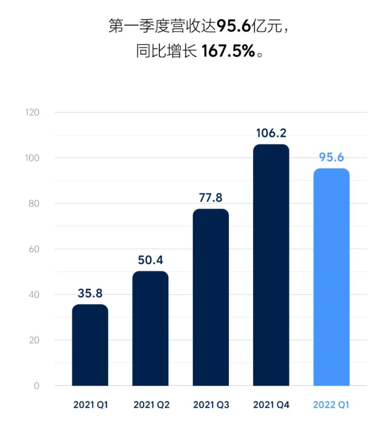 其他数据显示:现金流方面,截至第一季度末,理想汽车现金储备达 511.9 亿元。研发方面,2022 年第一季度理想的研发费用为人民币 13.7 亿元,较 2021 年第一季度增加 167.0%。