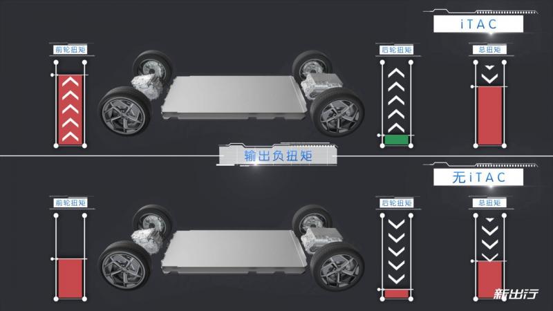 控制策略上,传统控制策略在面对打滑时只能通过制动降低扭矩的方式来控制车辆,而 iTAC 在提前预判的基础上针对电机响应速度快、转速调整更精确的特点,提供了转移扭矩、适当降低扭矩和输出负扭矩等多种方式。