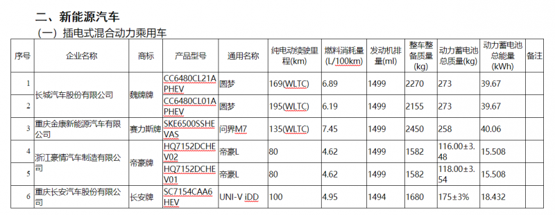 在今天的申报信息中, 工信部还发布了第三十九批《享受车船税减免优惠的节约能源 使用新能源汽车车型目录》,在这批目录中,有魏牌圆梦、AITO 问界 M7、吉利帝豪 L 雷神 Hi·X 和长安 UNI-V iDD 的纯电续航信息。