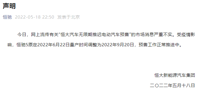 否认推迟预售 恒驰 5 更改量产时间为 2022 年 9 月