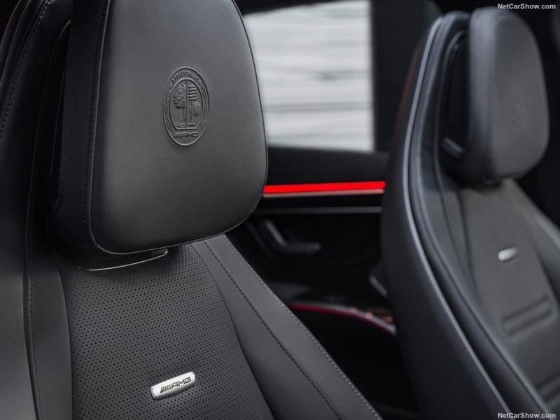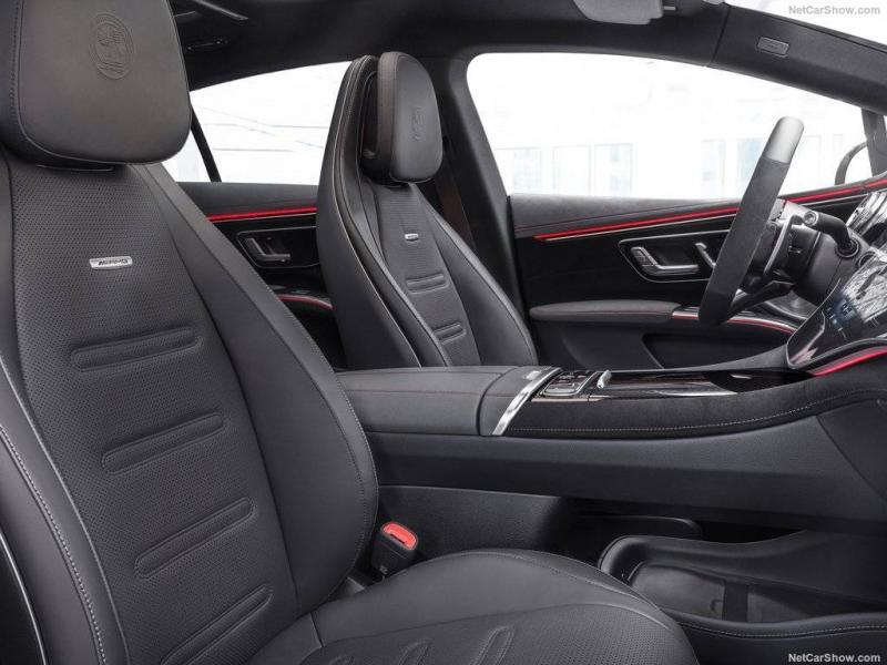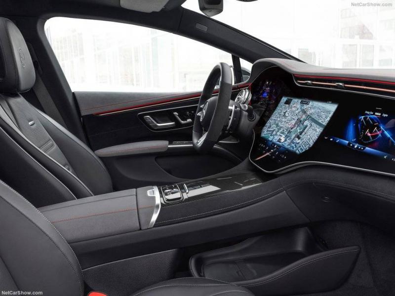 内饰方面整体设计与 EQS 完全相同,仅在配色方面采用了更加运动化的设计,例如全黑内饰配色加上红色缝线点缀。车内的三款屏幕尺寸分别为 12.3 英寸(仪表)、17.7 英寸(中控)、12.3 英寸(副驾)。