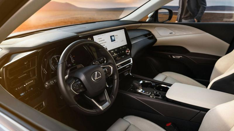 内饰部分,全新 RX 的设计变动不是很大,设计理念依旧是与 NX、RZ 等车型相同的“Tazuna 缰绳概念座舱” ,前方中控屏根据低/高配车型提供 9.8 英寸和 14 英寸可选,提供手机互联以及 OTA 等功能。