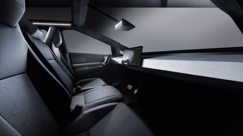 从图片中可以看到,虽然还是早期原型车,但是 Cybertruck 的总体内饰设计已经初具雏形。除去特斯拉标志性的中控大屏以外,仪表盘和 YOKE 方向盘也是存在的。值得注意的是,车辆前排的中央座椅是被折叠的状态,展开则是一个座椅的设计。