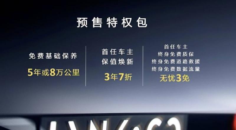 预售权益方面,新车享受 5 年或 8 万公里免费保养,首任车主 3 年 7 折保值焕新、终身免费质保、免费道路救援、免费数据流量。