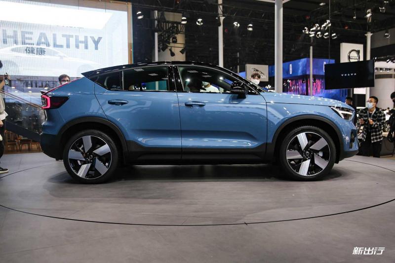 车身侧面来看,新车采用了溜背式的车身造型,在视觉上比 XC40 RECHARGE 更具动感,整体设计定位更像是一台跨界 SUV,车身与车顶采用了双色设计,彰显了新车的个性。