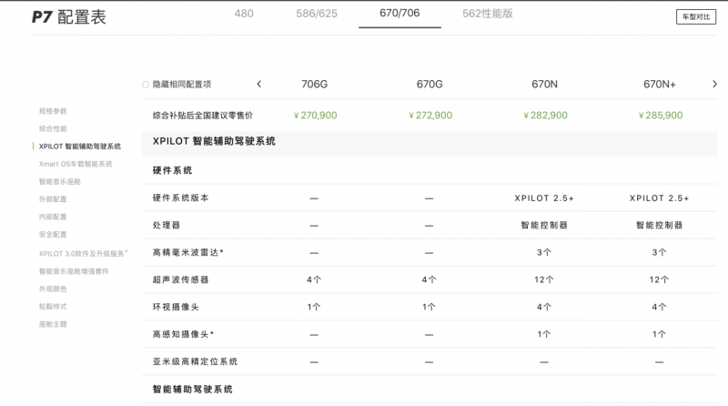 近日,从小鹏汽车官方配置表获悉,小鹏 P7 的 480G、670G 的版本车型,自 2022 年 5 月 9 日起下订的,将不配备高毫米波雷达、高感知摄像头、AEB 自动紧急制动、FCW 前向碰撞预警、LDW 车道偏离预警。与此同时,车型价格保持不变。480G 售价为 23.99 万元, 670G 为 27.29 万元。