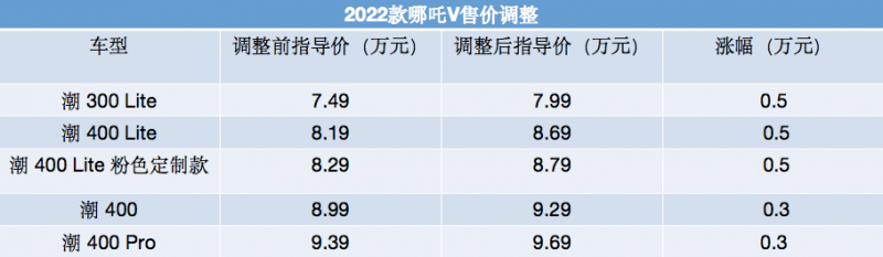 具体来看, 2022 款哪吒 V 潮 300Lite、潮 400 Lite 以及潮 400Lite 粉色定制款均上调了 5000 元,调整后最新指导价分别为 7.99 万元、8.69 万元和 8.79 万元。而潮 400 和潮 400 Pro 两款车型的最新售价则是 9.29 万元和 9.69 万元,上涨幅度为 3000 元。