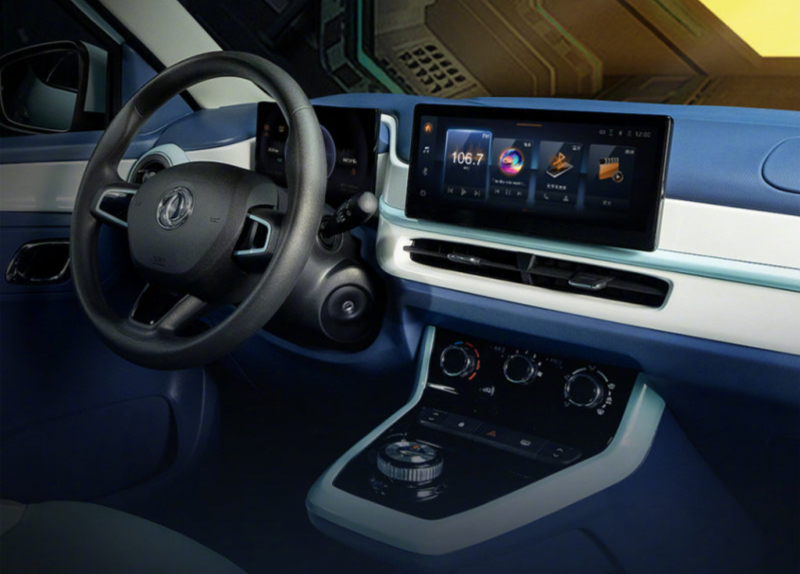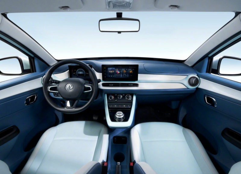 内饰方面, 采用简约的设计风格,采用薄荷绿的配色与车身颜色相呼应。 悬浮式中控屏与液晶仪表盘尺寸分别为 10 英寸与 7 英寸。中控屏下方分别集成空调出风口与空调控制面板。新车采用旋钮式换挡机构。
