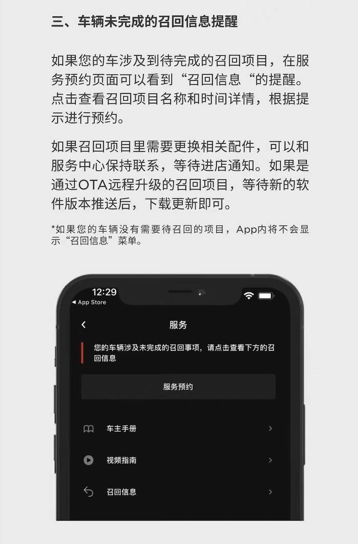 如果召回项目里需要更换相关配件,可以和服务中心保持联系,等待进店通知。如果是通过OTA远程升级的召回项目,等待新的软件版本推送后,下载更新即可。