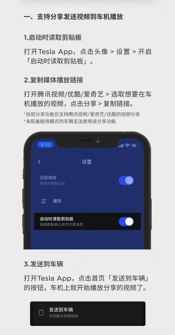 - 发送到车辆:打开 特斯拉 App ,点击首页发送到车辆 的按钮,车机上就开始播放分享的视频了。
