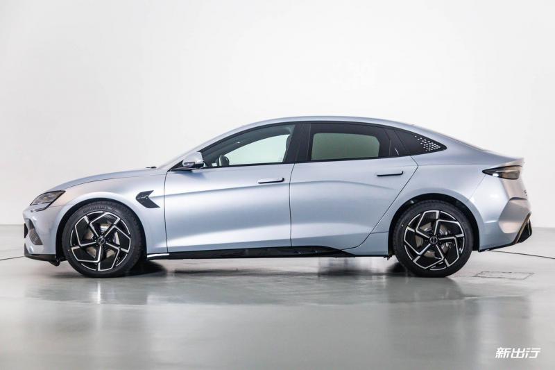 来到车身侧面,海豹整体车身采用前底后高的设计,整体姿态是偏向于低趴战斗的。尺寸方面,海豹的 车身长宽高分别为 4800mm/1875mm/1460mm,轴距为 2920mm   ,与比亚迪汉的轴距尺寸保持一致。另外得益于流线型的车身以及细节处的优化,海豹的 风阻系数为 Cd=0.219 ,这个数据还是十分优秀的。
