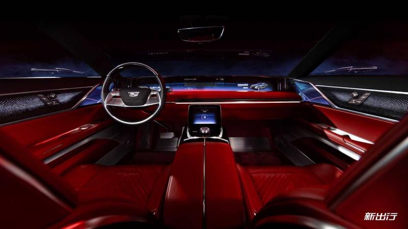 车内的设计与外观一样前卫,在红色和黑色之间点缀着多处屏幕,将复古豪华与未来感相结合。该车的中控台上为一整块 55 英寸的液晶显示屏,极其简约。