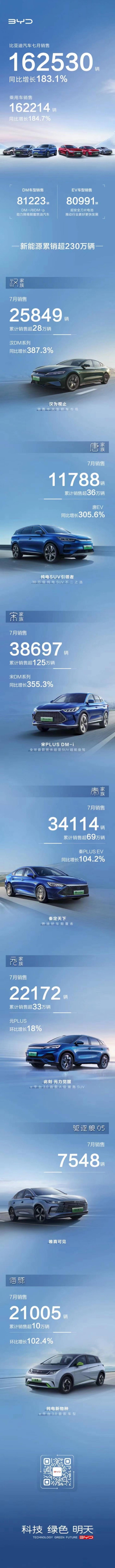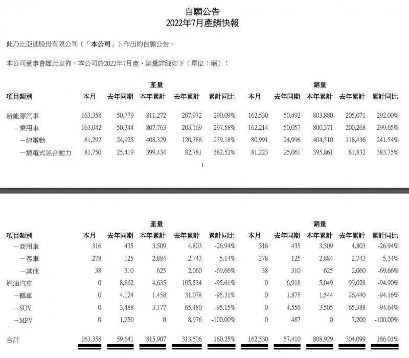 8 月 3 日,比亚迪公布其 7 月产销快报,7 月比亚迪新能源乘用车销量 162214 辆,去年同期为 50057 辆;新能源乘用车产量 163042 辆,去年同期为 50334 辆。