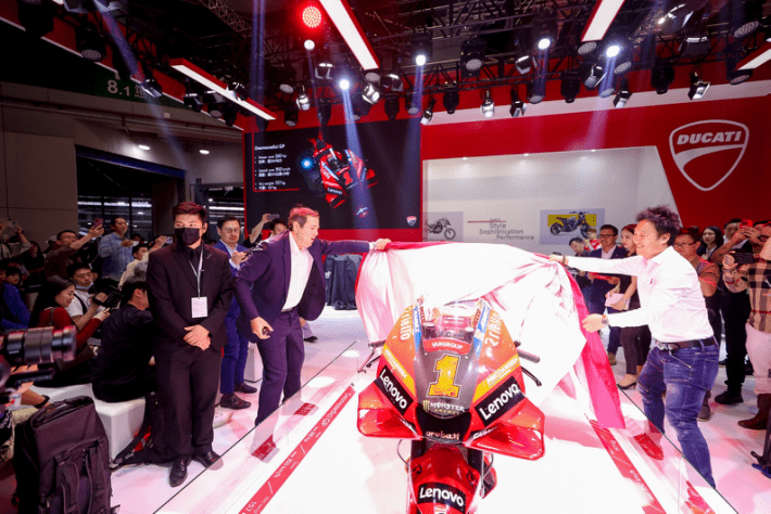 同时展出的还有杜卡迪联想车队MotoGP 世界冠军1号涂装 Francesco Bagnaia 的坐骑 Desmosedici GP 赛车。这款赛车集成了杜卡迪所有的核心技术,其搭载的 Desmodromic DOHC 发动机能够爆发超强动力,搭配杜卡迪无缝变速箱,拥有惊人的性能表现,再次助力杜卡迪联想车队征战 2023 赛季 MotoGP 世界摩托车大奖赛,书写用意式激情与技术征服 MotoGP的荣誉。