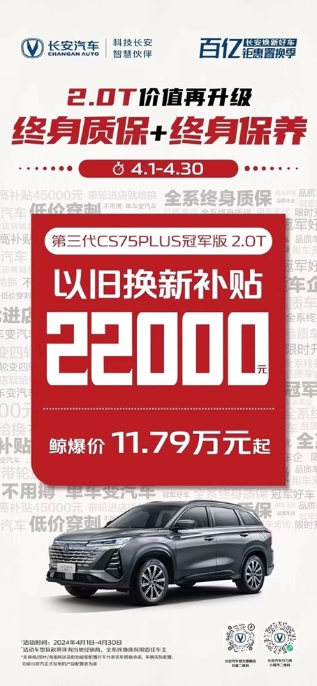 除了在品质上宠粉,长安汽车在福利上也一贯诚意满满。4月1日-4月30日,购买第三代CS75PLUS冠军版2.0T,还能够享受免费终身质保、免费终身保养,以及以旧换新22000元补贴,基础流量终身免费、增值流量3年免费(2G/月)等优惠政策。而购买UNI-V2.0T则在免费终身质保、免费终身保养的基础上,可享受以旧换新20000元等补贴,每项福利都展现了长安对消费者的关怀与回馈。对比来看,星越L和星瑞仅提供5年或15万公里质保服务和5年不发流不限量流量,谁更有诚意当下立判,可见买长安,省钱更省心。