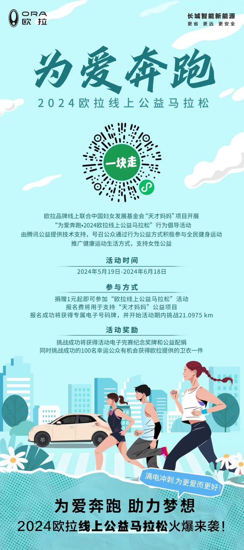 线下健康跑,线上公益行,欧拉品牌以“体育+公益”的形式,持续为热爱输入正能量。欧拉品牌联合中国妇女基金会“天才妈妈”项目,同步开启了“为爱奔跑•2024欧拉线上公益马拉松”活动。在5月19日-6月18日期间,捐赠1元起即可参加“欧拉线上公益马拉松”活动,报名费将用于支持“天才妈妈”公益项目。此次公益活动,不仅助力了“天才妈妈”公益项目,也与更多人共享运动的快乐、探寻更健康的生活方式。