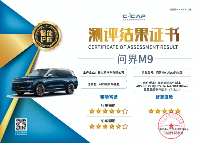 此前,中汽中心汽车测评管理中心对外发布了C-ICAP车辆评价结果,ICAP规程聚焦智能网联系统的应用场景与技术特点,制定了极为严格的测试标准,是国内评估汽车智能化的最重要官方评测测试中,共有极狐阿尔法S,蔚来ES6、奔驰C级等13款车型,涵盖了纯电、增程、燃油多项品类。问界M9同台测试,在辅助驾驶与智慧座舱测试中分别获得“五星+”与“五星”评价,展现了硬核的智能技术实力。
