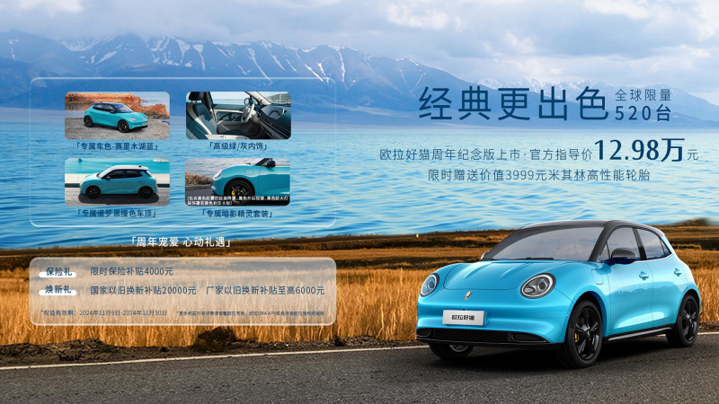 11月9日,值此欧拉汽车全球用户即将突破50万之际,同时为纪念欧拉好猫上市四周年,欧拉汽车再度携手用户为爱共创,推出“欧拉好猫周年纪念版”。新车全国建议零售价12.98万元,限量发售520台,采用专属“赛里木湖蓝+暹罗黑撞色车顶”套色车身,搭配专属“暗影精灵”外观套装,并限时赠送“价值3999元米其林高性能轮胎”专属超值配置,让经典更出色。