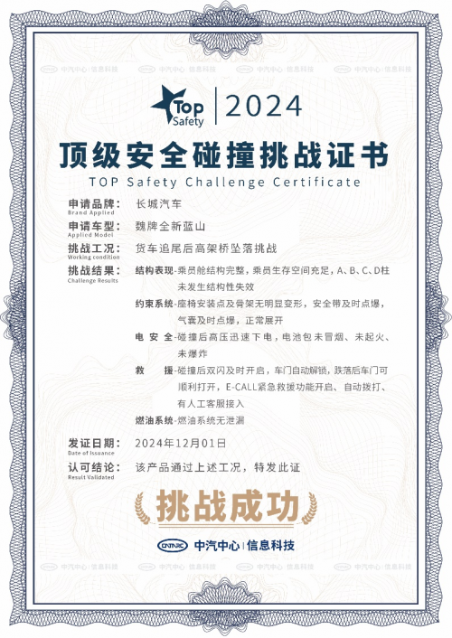 2024年12月2日-4日,在第13个全国交通安全日之际,作为长城汽车旗下高端新能源品牌,魏牌携手中汽中心TOP Safety开展了一场难度极大的“行业首个高架桥坠落挑战”。作为此次挑战的主角,魏牌全新蓝山以卓越的整车、电池、主被动、智驾等安全性能,成功通过这一极限测试,再次印证了其在安全领域的强劲实力和领先地位。