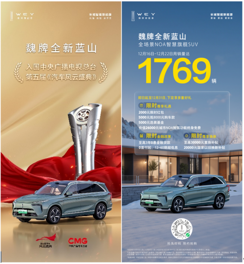 近期,魏牌全新蓝山迎来了“双喜临门”——不仅成功入围中央广播电视总台第五届《中国汽车风云盛典》,成为榜单中唯一一款国产新能源中大型大六座SUV,还在市场端交出了周销量(12.16-12.22)1796辆的优秀成绩单,周周连涨,从权威认证到细分市场一路长虹,魏牌全新蓝山以双重实力证明了其在新能源SUV市场中的强劲竞争力。