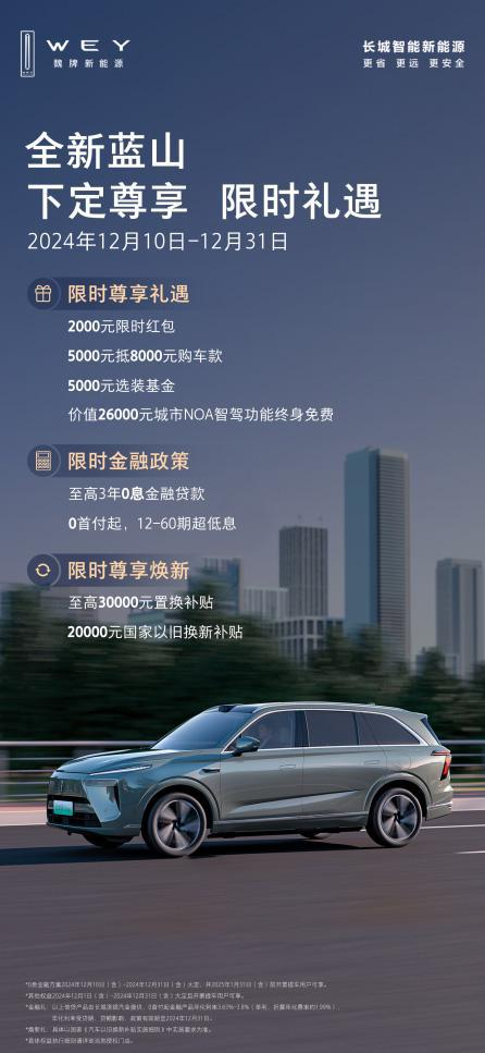 显而易见,从央视权威背书到销量数据的稳健增长,魏牌全新蓝山正以出色的产品实力和市场表现,成为越来越多中国家庭的信赖之选。临近年底,随着最高20000元的国补换新政策进入尾声,全新蓝山福利加码推出至高3年0息金融贷款,首付0元起,最长60期的超低息方案,为用户带来更加灵活的购车选择。且现在购买魏牌全新蓝山还可尊享限时礼遇,包含2000元下订红包、5000元膨胀补贴直抵8000元购车款、价值26000元的城市NOA智驾功能终身免费以及5000元选装基金,为用户打造专属座驾。如果你也在寻求一款既豪华又实用的家庭座驾,魏牌全新蓝山无疑是值得关注的选择。