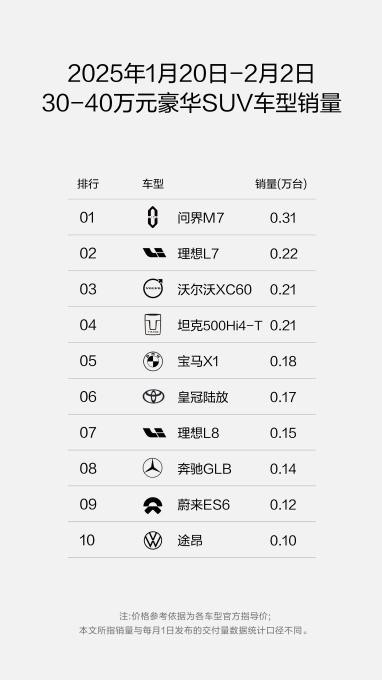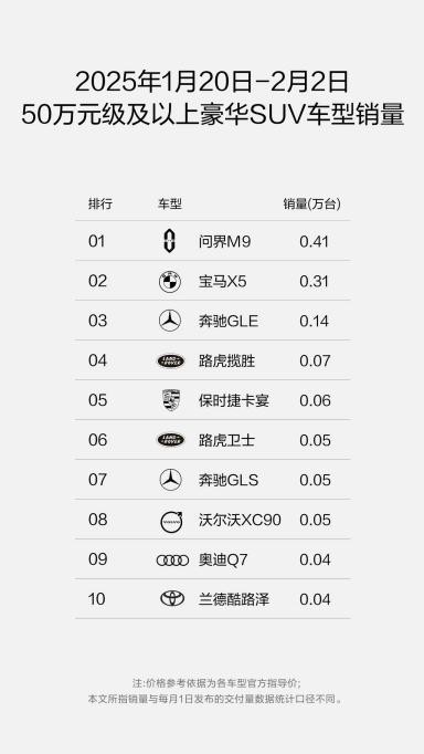 与此同时,销量周榜进一步反映出问界的热销势头。数据显示,2025年第4至5周(1.20-2.2),问界M9稳坐50万元级及以上豪华SUV车型销量周榜第一,问界新M7则稳坐30-40万元豪华SUV车型销量周榜第一。喜迎新年开门红,持续引领高端市场,问界究竟有何成功秘诀?