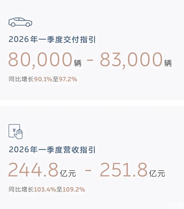 展望未来,预计今年一季度交付新车8-8.3万辆,同比增长90.1%-97.2%;一季度营收244.8-251.8亿元,同比增长103.4%-109.2%。