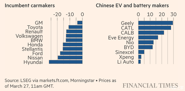 所以这一波油价暴涨,一定程度上,推动了全球新能源化的进程。从冲突开始的2月27号算起,中国新能源领域的车企和能源公司股价大涨,尤其是吉利、宁德时代、中创新航的股价都涨了20%以上,而形成鲜明对比的是,现代、尼桑、福特、斯特兰蒂斯等传统燃油车企业,股价出现了大跌。